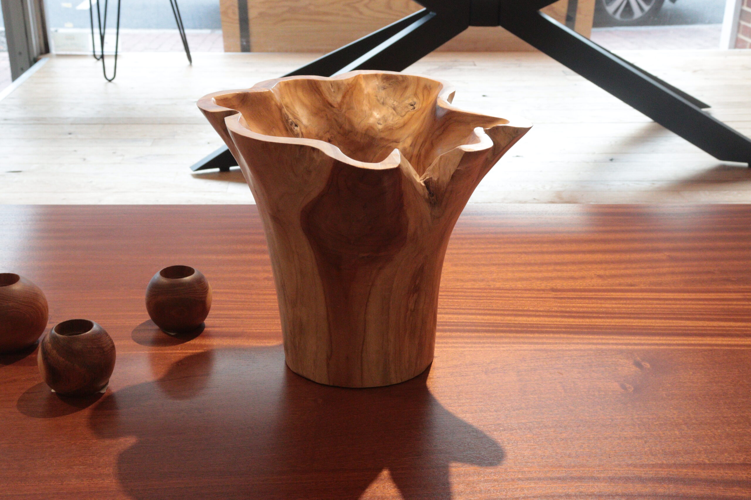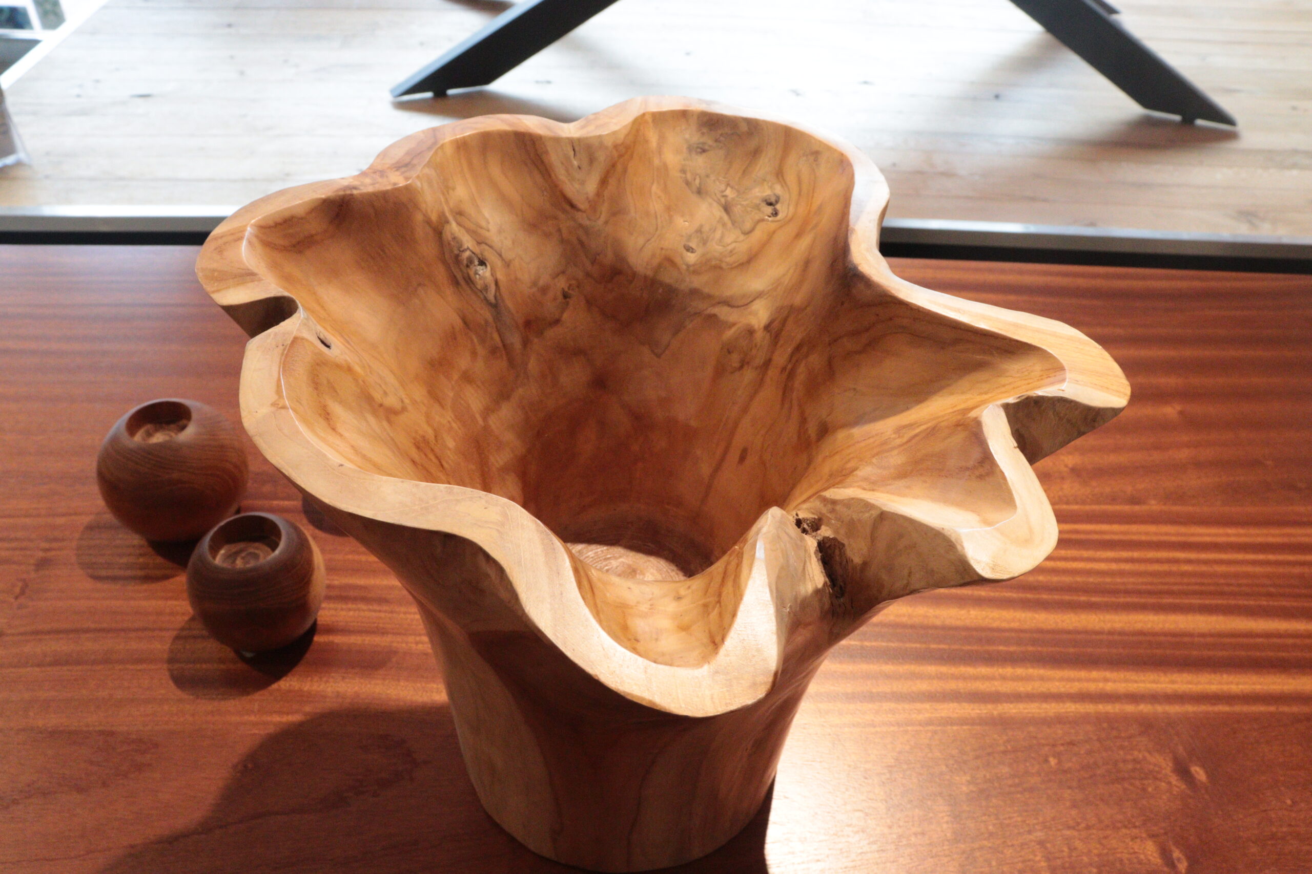 Perfect for displaying flowers or any other decor, this wooden vase is handcrafted from teak root durable enough to last generations. This vase is a truly one of a kind piece as no two vases are exactly the same due to the natural variations in the wood. Enhance your space with this unique wooden vase, making it a distinctive focal point.