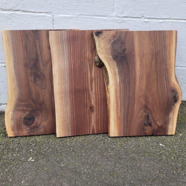 Looking to add that extra pop for your next charcuterie dinner.  Consider our solid live edge walnut pieces.  All finished in a food safe oil. These boards vary and no two are alike.  They measure approximately 10 x 12.  Please reoil after each use until wood keeps the color.